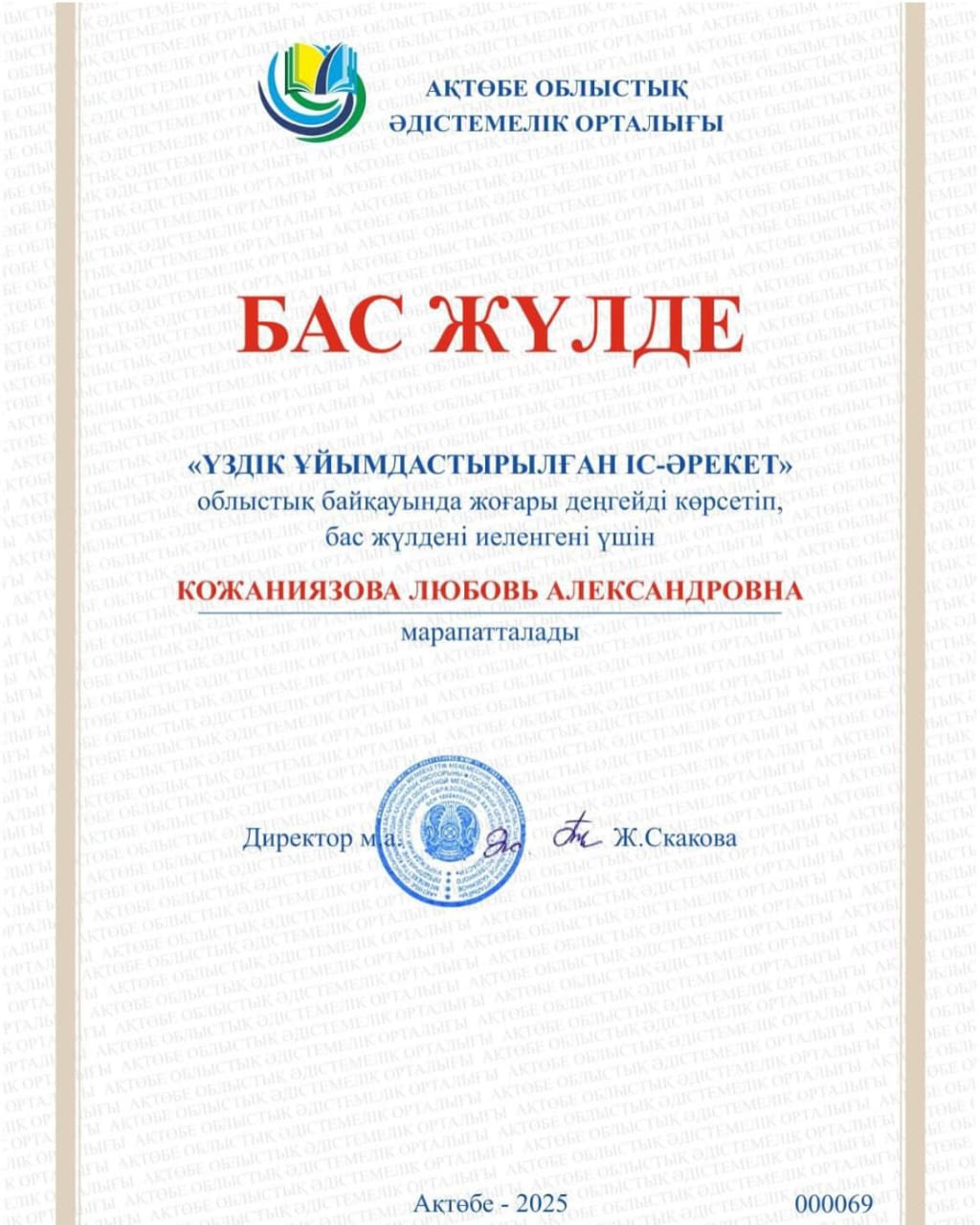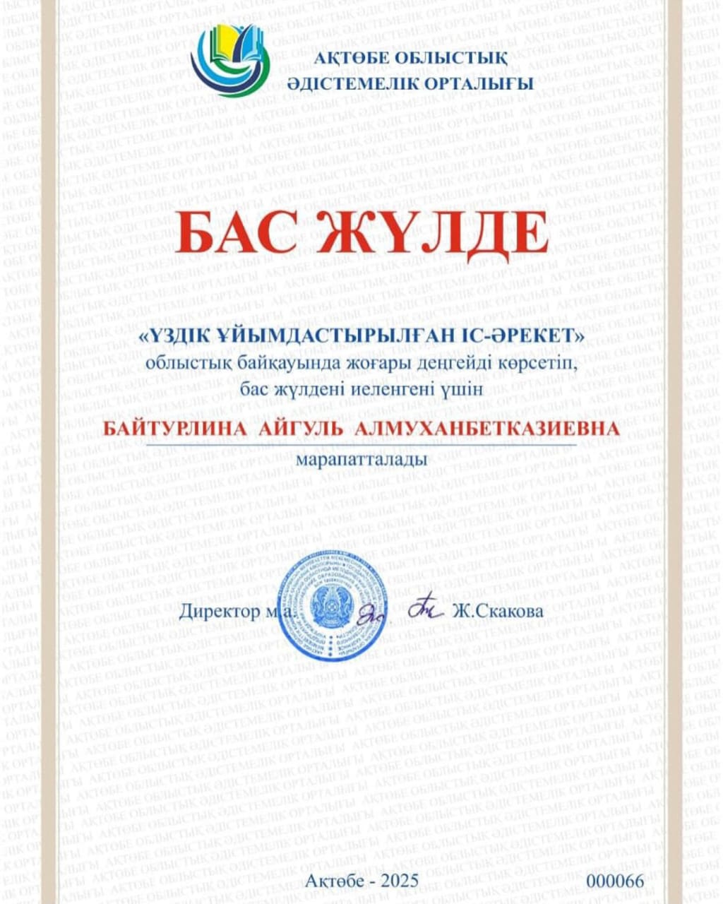 Ақтөбе облысы әдістемелік орталығының ұйымдастырылуымен өткен «Үздік ұйымдастырылған іс-әрекет» облыстық байқауында бас жүлде иеленген балабақшамыздың тәрбиешілері Байтурлина Айгуль Алмуханбетказиевна мен Кожаниязова Любовь Александровна құттықтаймыз.