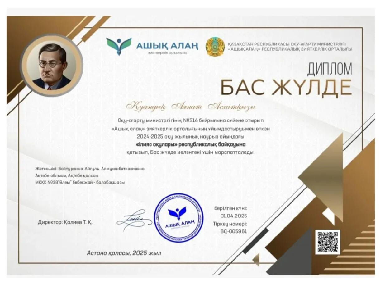 Оқу-ағарту министрлігінің №514 бұйрығына сүйене отырып «Ашық алаң» зияткерлік орталығының ұйымдастыруымен өткен 2024-2025 оқу жылының наурыз айындағы «Илияс оқулары» Республикалық байқауына қатысып бас жүлдемен марапатталды.