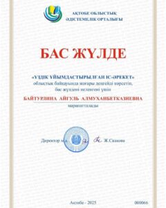 Оқу-ағарту министрлігінің №514 бұйрығына сүйене отырып «Ашық алаң» зияткерлік орталығының ұйымдастыруымен өткен 2024-2025 оқу жылының наурыз айындағы «Илияс оқулары» Республикалық байқауына қатысып бас жүлдемен марапатталды.